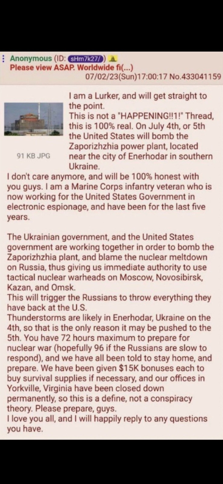 Posté deux jours avant l'annonce de Zelenski, par un soi-disant vétéran de l'infanterie du Corps des Marines qui travaille maintenant pour le gouvernement des États-Unis dans l'espionnage électronique, le texte indique que l'Ukraine et les Etats-Unis travailleraient ensemble pour bombarder la centrale de Zaporijia, et ensuite accuser la Russie d'avoir placé des charges explosives.