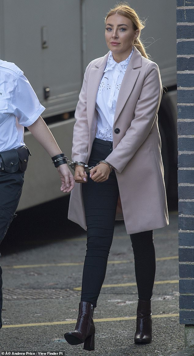 Ayshea Gunn menottée sur le chemin de la prison, quittant le tribunal après avoir été reconnue coupable d'avoir eu une relation avec un détenu