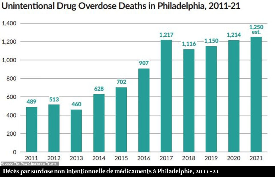Seulement 2 milligrammes de fentanyl, soit l'équivalent de la taille d'une pointe de crayon, sont mortels. Les autorités ont fait des efforts pour arrêter les dealers, mais admettent qu'il n'y a pas de fin en vue. Le sédatif animal Xylazine, également connu sous le nom de "tranq", exacerbe la crise en étant combiné au fentanyl et en provoquant des abcès "mangeurs de chair" et une perte musculaire chez les toxicomanes.