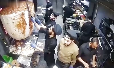Égypte : dans un restaurant, une broche verticale de poulet kebab empilée sur 500 kg perd soudainement l'équilibre pendant le service. Les cuisiniers découpent la viande quand la structure bascule et s'effondre dans un f...