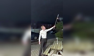 Ce mec bourré a eu la brillante idée de tenir un feu d'artifice directement dans sa main au lieu d'utiliser le tube de lancement. Il l'allume, réalise son erreur et la balance au dernier moment. Problème : la fusée ne dé...