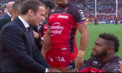 Lors du protocolaire serrage de main du président avec les joueurs des 2 clubs finalistes, 3 joueurs (Josua Tuisova, Alivereti Raka et Peceli Yato) fidjiens se sont agenouillés pour serrer la main à Emmanuel Macron, trad...