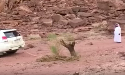 En Arabie Saoudite, un homme tente d’arracher la souche d’un arbre avec son puissant véhicule. Mais l’arbre ne va pas se laisser faire et va se venger avec une branche qui va s’arracher et venir éclater la vitre arrière ...