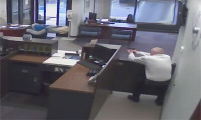 Laurence Turner a été tué alors qu'il tentait de braquer une banque dans l'Illinois. Sur ces images, on peut l'homme surgir dans la banque en brandissant une arme et se faire tirer dessus par un agent de sécurité. A savo...