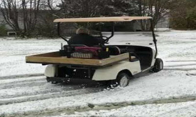 Une femme de 91 ans est filmé par son petit-fils alors qu'elle s'amuse à utiliser une voiture de golf pour faire du drift sur de l'herbe recouverte de neige. On peut voir que mamie maitrise encore bien le manche pour réa...