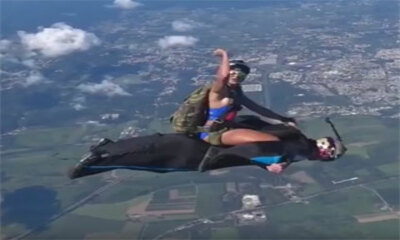 Quand une parachutiste rencontre un wingsuiter cela nous donne des images complètement folles et cool. On peut voir une femme à cheval sur un wingsuiter le temps de filmer cette scène assez insolites. https://www.yout...