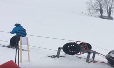 Des amis qui aiment pratiquer le ski hors station hivernal ont décidé de se fabriquer leur propre remontée mécanique. Pour cela, ils utilisent une voiture à laquelle ils ont fixé un câble sur l'axe de la roue qui en accé...