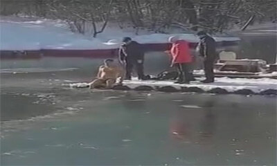 Dans le parc Gagarine à Simferopol, un chien s'est retrouvé coincé au milieu d'lac gelé et a été sauvé par un bon samaritain. L'homme n'a pas hésité une seconde pour retirer ses vêtements et se retrouver uniquement en ca...