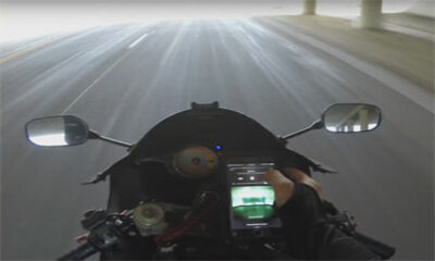 Aux États-Unis, un motard au guidon de sa moto regarde son téléphone et interagis avec l'application Spotify pendant qu'il est en train de rouler. Résultat : il part à la dérive sur côté, vient heurter le trottoir, chute...