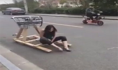 En Asie, un couple qui veut s'amuser décide de se fabriquer une charrette Audi pour ensuite se faire tracter par une moto. Sur cette vidéo, on peut voir madame assise sur sa charrette les jambes écartées et toute heureus...