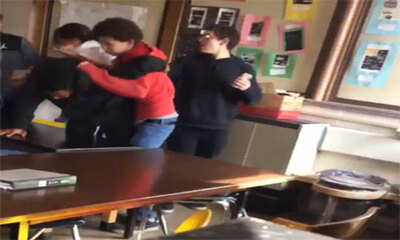 Lors d'une bagarre entre deux élèves dans une classe aux États-Unis, la professeur est débordée et reçoit un coup au visage. De suite, un élève se met encore et vient à la rescousse de sa prof en frappant l'élève respons...