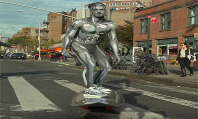 À l'occasion d'Halloween, un homme s'est déguisé en Surfer d'argent (The Silver Surfer), qui est un super-héros évoluant dans l'univers Marvel. On peut le voir se promener dans les rues de New York avec sa planche de sur...
