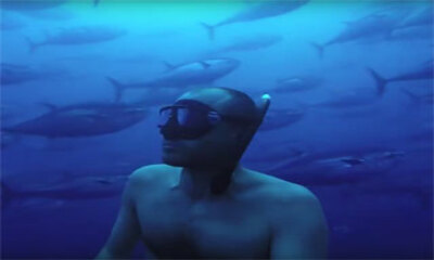 L'apnéiste professionnel espagnol Miguel Lozano se filme avec des amis alors qu'ils ont au milieu d'un banc de thons contenu dans un filet d'élevage situé au large de l'île de Malte, en mer Méditerranée. Je ne sais pas, ...