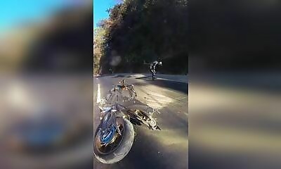 Un motard fait l'erreur de vouloir doubler par la droite et finit sa route par un petit envol