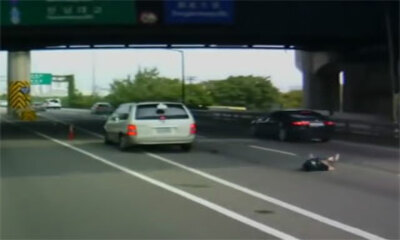 Un motard qui rate son virage sur un pont vient chuter puis glisser et ensuite tomber du pont pour atterrir plus bas sur l'autoroute. Je n'ai aucune information sur l'état de santé de ce motard, mais d'après les commenta...