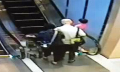 En Chine, la caméra de sécurité d'une grand centrer commercial a filmé l'accident d'un couple de vieux face à un escalator. Le couple qui semblait découvrir l'escalator n'ont pas su comment l'emprunter et ont chuté dessu...