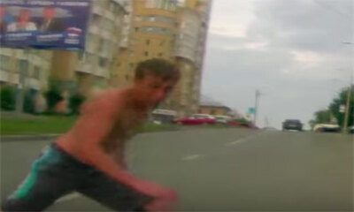 Alors lui, il voulait vraiment sa fraude à l'assurance. En Russie, la caméra embarquée d'un automobiliste a filmé un homme torse nu qui s'est jeté volontairement sur sa voiture pour tenter une fraude à l'assurance. Mais ...