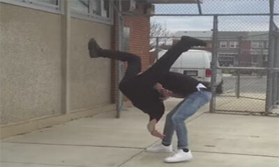 A la sortie d'un lycée, deux élèves pas content veulent se battre et semblent déterminés. Mais l'un des gars est peut-être mieux préparer, car celui-ci va donner une belle droite qui va faire trébucher son adversaire pou...