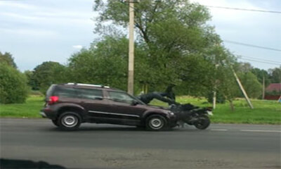 Le 10 aout 2016 à Saint-Pétersbourg en Russie, un motard qui est à l'arrêt sur un cédez-le-passage a mal anticipé la vitesse d'un véhicule roulant assez vite. Le motard s'engage alors sur la route en grillant la priorité...