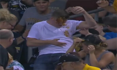 Ce mercredi 10 août 2016 lors du match de baseball qui opposait les Padres de San Diego et les Pirates de Pittsburgh à San Diego, un supporter des Pirates s'est cassé la figure avec son assiette de nachos en voulant récu...