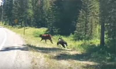 Des images assez rares montrant l'attaque d'un grizzly. Ce jeudi 4 août 2016, un automobiliste qui se rendait à la pêche a filmé sur son trajet la terrible attaque d'un grizzly sur une vache près de Cody, dans le Wyoming...