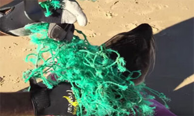 Le 19 juillet 2016 à Manyana Beach en Australie, un bébé phoque est sauvé d'un filet de pêche par des promeneurs. C'est le genre d'incident qui arrive avec les filets de pêche jetées dans les eaux et qui bien souvent dér...