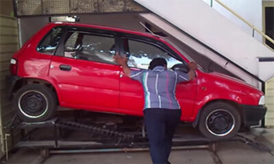 En Inde, un homme a aménagé un petit garage sous un escalier pour y garer sa Suzuki Alto. Après avoir ouvert les portes qui donnent sur sa maison, l'homme déplace une rampe montée sur roulettes sur laquelle il peut stati...