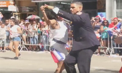 Lors de la Dominican Day Parade à New York, un officier de police pris par l'ambiance à décidé de quitter son poste pour aller faire quelques pas de danse. On peut le voir s'approcher de la parade de pour rejoindre un co...