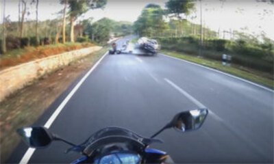 Ce dimanche 26 juin 2016 à Lembang en Indonésie, un motard a dû se coucher pour éviter une voiture en face qui doublait sur sa voie. Cette manœuvre de kamikaze lui a sauvé la vie, car il a glissé sur le côté gauche de la...