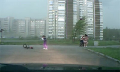 Des images obtenues à partir d'une caméra embarquée d'un véhicule qui nous montrent des vents violents soufflés sur une ville en Russie. Alors qu'un enfant fait du vélo, celui-ci se retrouve emporter par les vents violen...