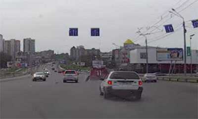 Un automobiliste au volant d'un SUV Volvo, a essayé d'échapper à la police lors d'une course-poursuite le jeudi 9 juin 2016 à Marijampole, en Lituanie. Alors que le véhicule de police tentait de bloquer le fuyard, ce der...