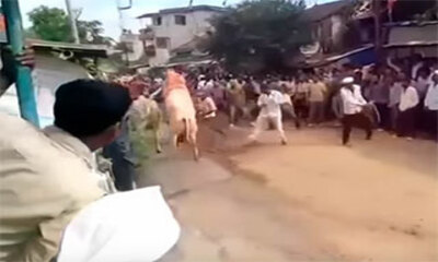 En Inde les animaux sont sacrés et certains n'aiment pas perdre leurs temps dans les bouchons des villes. C'est le cas de ce taureau qui extrêmement pressé fonce dans une foule et pour éviter un danger et ne pas perdre d...
