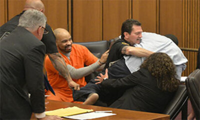 Le père de famille Van Terry qui jeudi à Cleveland en Ohio s'adressait au juge, lorsqu'il a sauté par-dessus une table et essayé de frapper Michael Madison, le coupable du meurtre de sa fille et de deux autres jeunes fem...