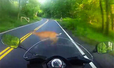 Alors qu'il roule sur une petite route de campagne, ce motard va avoir la frayeur de sa vie à cause d'un cerf effrayé par des randonneurs qui va surgir. Ce dernier va traverser la route sans prendre le temps de regarder ...