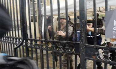Lors des manifestations à Paris contre la loi du travail qui a été validée, des manifestants ont attaqué des militaires au Musée de l'Armée, place des Invalides. Sur ces images, on peut voir un gendarme retenir la grille...