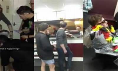 Alors qu'il est complètement ivre et torché, ce jeune homme roupille profondément et ses potes qui voulaient sortir ont décidé de l'emmener avec lui. Pour cela, ils l'ont scotché à un fauteuil à roulettes pour lui gribou...