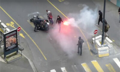 Lors de la manifestation à Rennes ce jeudi 28 avril 2016, une voiture de police a renversé un homme à scooter pour ensuite prend la fuite. Blessé et resté à terre, l'homme recevra de l'aide de la part de quelques manifes...