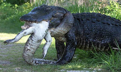 Des images rares et impressionnantes capturées dans la réserve animale de Lakeland, en Floride, aux États-Unis. Plusieurs personnes se promenant dans la réserve ont aperçu un alligator se promener, sa victime dans la gue...