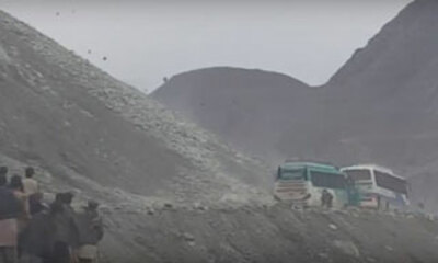 Au Pakistan, des passagers d'un bus doivent trouver refuge derrière le véhicule pour éviter un éboulement avec des rochers. On peut voir sur la vidéo, des personnes derrière le bus en espérant qu'aucun cailloux ne viendr...