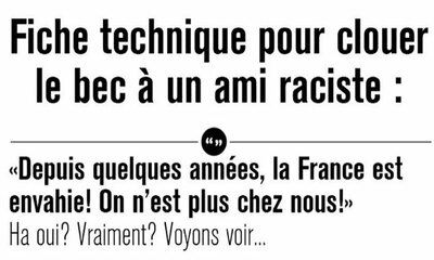Vous avez du mal avec les préjugés et les propos racistes de certaines de vos connaissances, proches ou collègues de bureau ? Alors voici l'infographie avec la fiche technique pour clouer le bec à un ami raciste. Par exe...