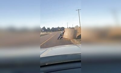 Un policier américain n'hésite pas à donner de sa personne pour enlever une grosse botte de paille, et éviter ainsi des accidents.