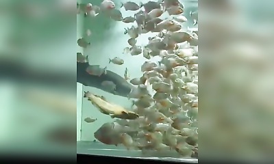 Dans un immense aquarium rempli de piranhas (plus d'une centaine facilement), on balance un poisson-chat comme repas. C'est direct brutal : les piranhas l'attaquent tous en même temps dans un festin sanglant. Le malheure...