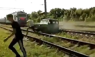 Coincé entre deux rails, cet homme réussit à s'en extirper in extremis. Sa voiture, elle, n'aura pas la même chance.