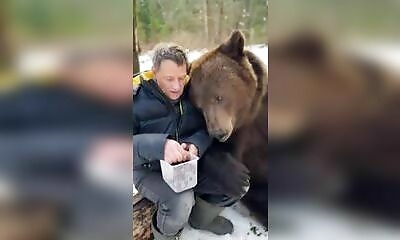 En Russie, un homme nourrit un ours énorme en lui donnant des cerises. L'animal, impatient et amateur de sucre, mordille le bras de l'homme pour lui faire comprendre qu'il a faim…