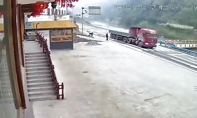 Traverser cette route en Chine semble très délicat (c'est certainement pour cela qu'il y a deux passages zébrés côte à côte), mais cet homme tente tout de même le coup, alors qu'un camion arrive à pleine vitesse... ...