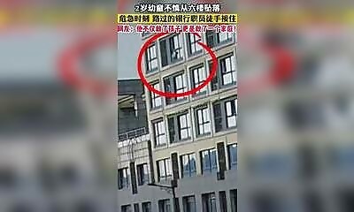 Moment tendu en Chine, alors qu'un enfant de 2 ans est au bord d'une fenêtre du sixième étage et bascule subitement. Heureusement, deux employés de banque se trouvent juste en bas…