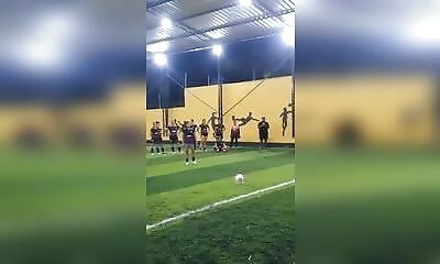 Très heureuse d'avoir (pu enfin ?) empêché un ballon de rentrer dans ses cages, cette gardienne fête sa victoire, un peu trop tôt…