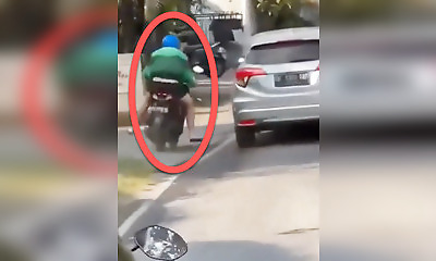 Pour doubler une voiture, et parce que la voie de droite est occupée, ce scooteriste tente alors un mouvement audacieux : Doubler par la gauche, en utilisant le trottoir.