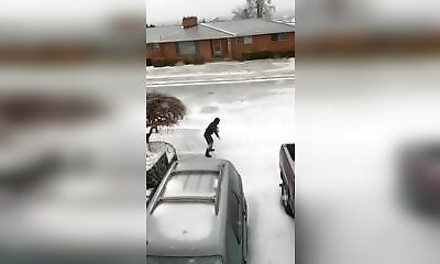 Pour aller jeter un (petit, très petit) sac-poubelle, cet homme doit affronter le froid, mais surtout le verglas qui se trouve à l'extérieur de sa maison. Et c'est tout un spectacle.