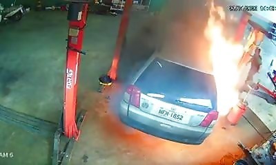 Ce garagiste vient certainement de connaître sa pire journée de travail… L’homme commet une terrible erreur en faisant de la soudure près d’une voiture en réparation. Malheureusement, les projections de matière incandesc...